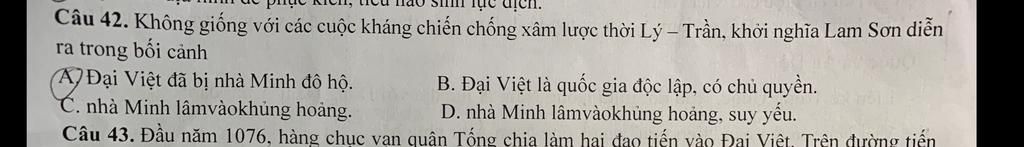 `42.` `A.` Đại Việt bị nhà Minh đô hộ