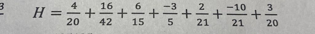 `H = (4/20 + 3/20) + (2/21 - 10/21) + 16/42 + 6/15 + (-3)/5`