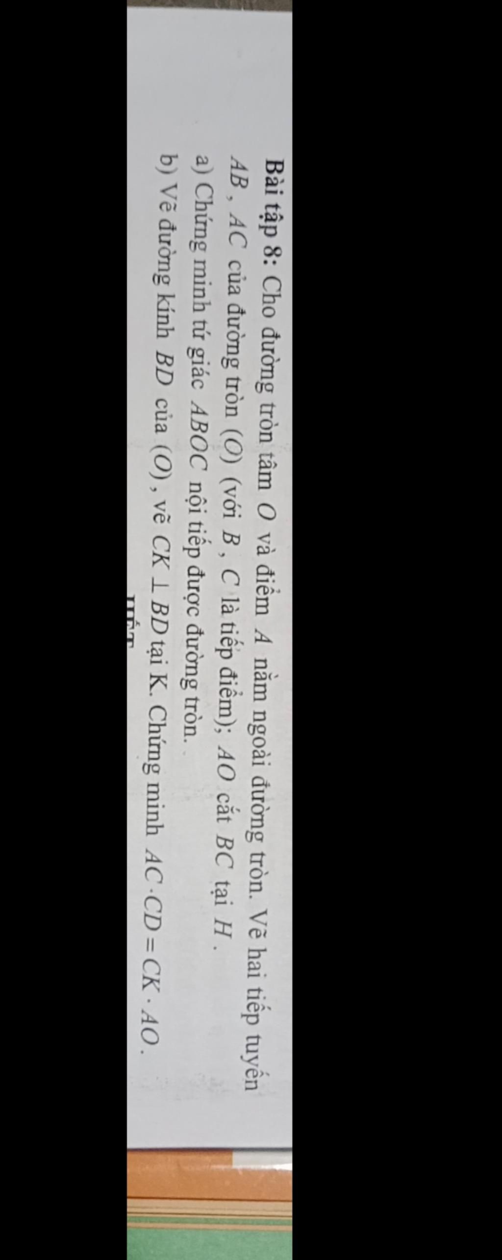 ⇒ $\left \{ {{\text{A, B, O ∈ đường tròn đường kính AO}} \atop {\text{A, C, O ∈ đường tròn đường kính AO}}} \right.$