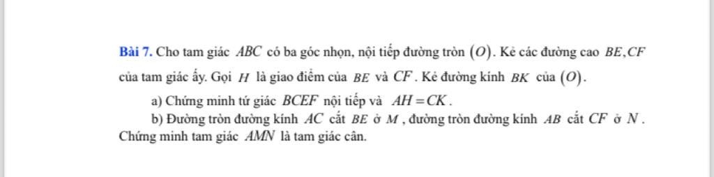 a) Chứng minh tứ giác BCEF nội tiếp và AH=CK.