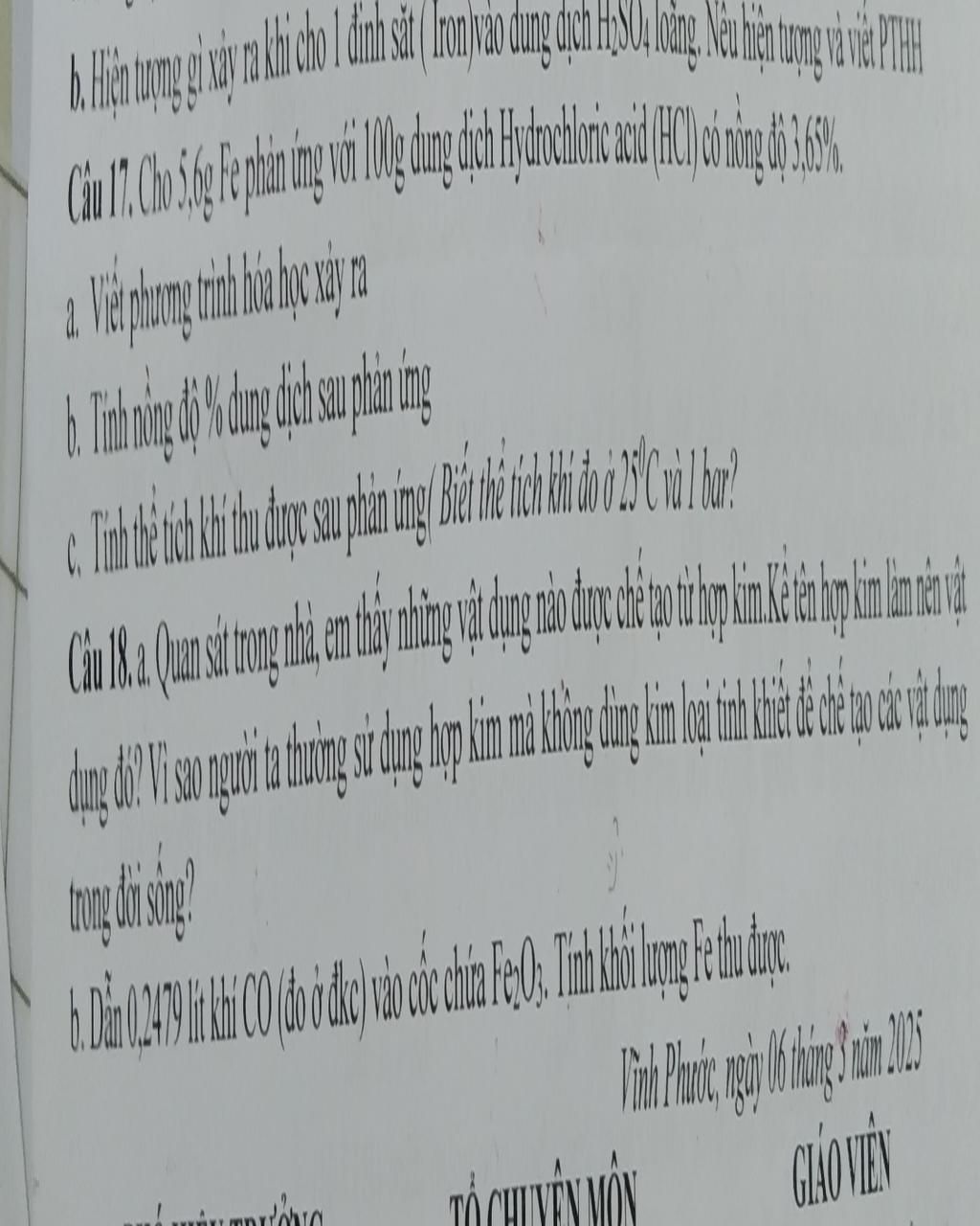 `a)` $\rm PTHH:$ `Fe + 2HCl -> FeCl_2 + H_2`