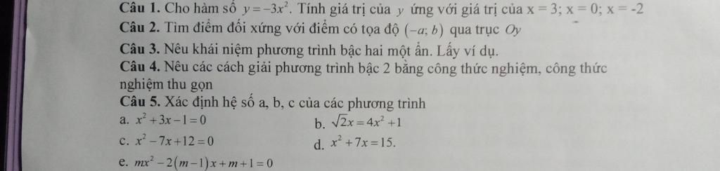 Câu 3. Nêu khái niệm phương trình bậc hai một ẩn. Lấy ví dụ.