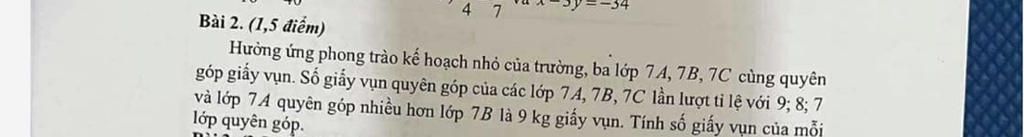 Theo đề bài, số giấy vụn quyên góp của các lớp $\rm 7A,7B,7C$ lần lượt với tỉ lệ `9;8;7` và lớp $\rm 7A$ quyên góp nhiều hơn lớp $\rm 7B$ là `9` kg giấy vụn, ta có: