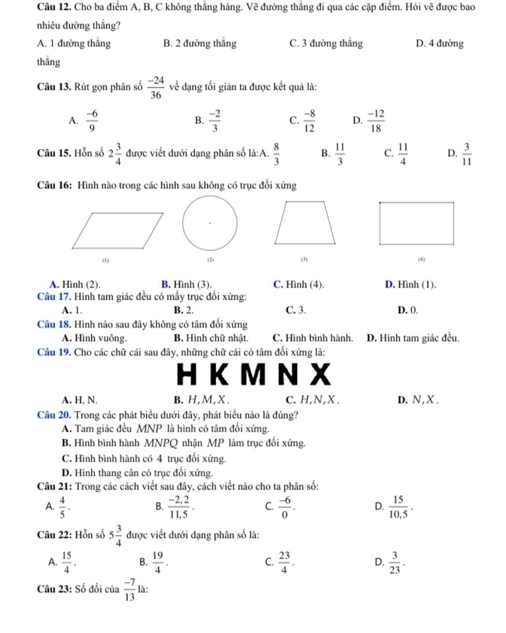 Câu 12. Cho ba điểm A, B, C không thẳng hàng. Vẽ đường thẳng đi qua các cặp điểm. Hỏi vẽ được bao