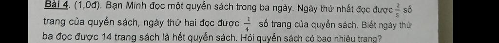 Sau 2 ngày Minh đọc được số phần quyển sách là : 25+14=1320(số trang quyển sách) 14 trang ứng với 1 -1320=720(số trang quyển sách) Quyển sách dày số trang là : 14:720=40(trang) Đáp số : 40 trang