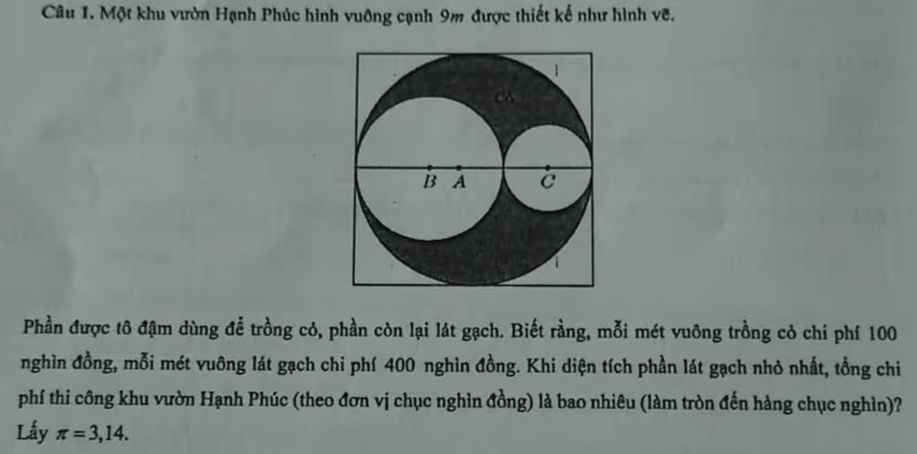 Thiết kế khu vườn Hạnh Phúc hình vuông cạnh như hình vẽ. Phần được tô đậm dùng để trồng cỏ, phần còn lại lát gạch. Biết mỗi mét vuông trồng cỏ chi phí nghìn đồng, mỗi mét vuông lát gạch chi phí nghìn đồng. Khi diện tích phần lát gạch là nhỏ nhất thì tổng chi phí thi công vườn hoa Hạnh Phúc bằng (làm tròn đến hàng nghìn)?