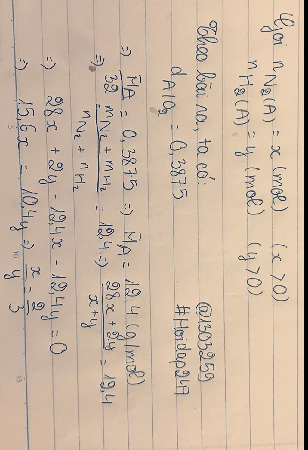 `a)` Đặt `n_(N_2) = x` `(` mol `)` `;` `n_(H_2) = y` `(` mol `)`