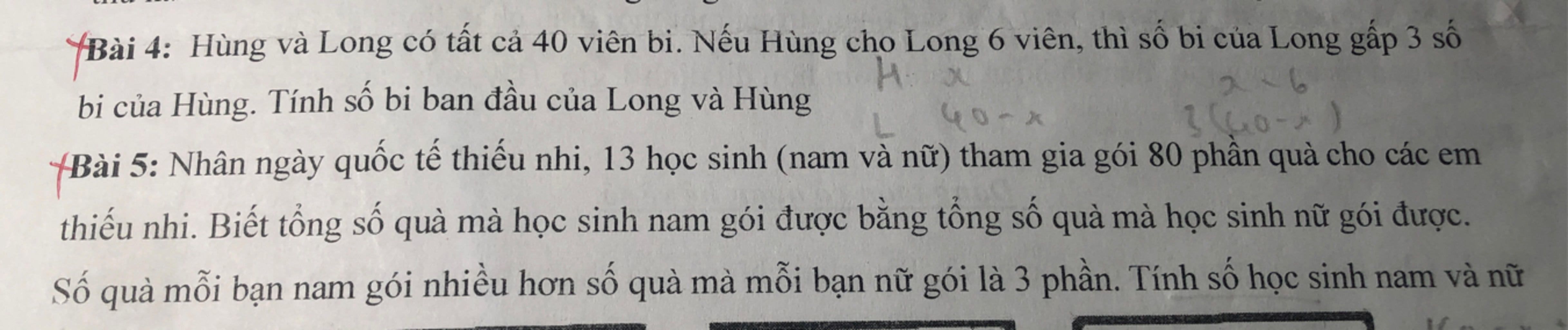 Bài 4: Long có $24$ viên bi, Hùng có $16$ viên bi