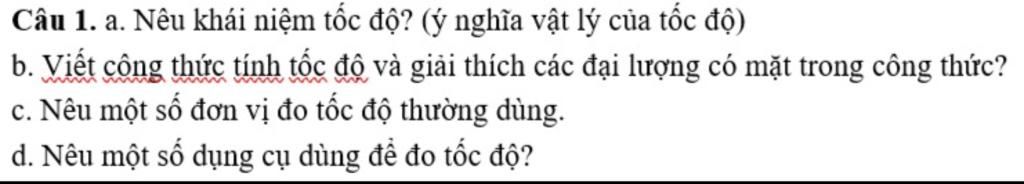 `a)` `+` Tốc độ là đại lượng vật lý cho biết sự nhanh, chậm của chuyển động, được xác định bằng quãng đường đi được trong một đơn vị thời gian.