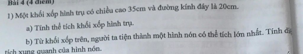 b) Từ khối xốp trên, người ta tiện thành một hình nón có thể tích lớn nhất. Tính diệ