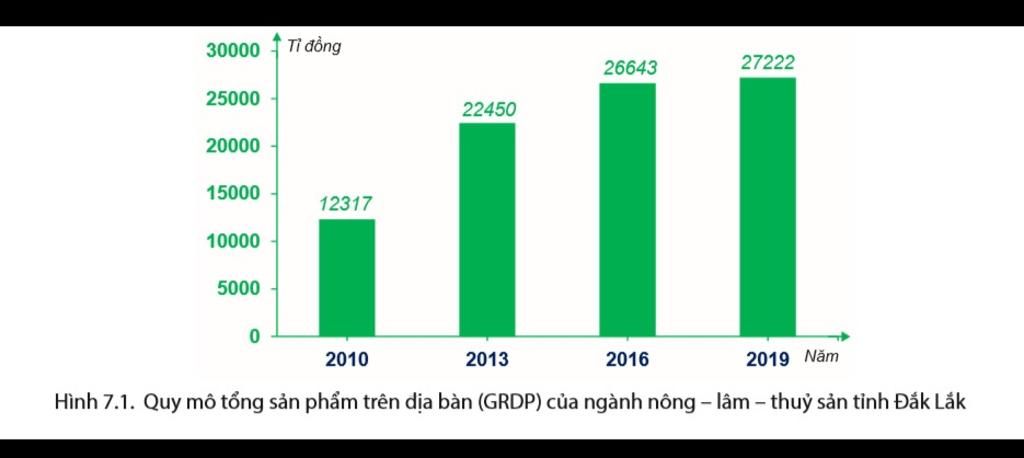 2/ Dựa vào H7.1, nhận xét sự thay đổi GDRP ngành nông-lâm-thủy sản của tỉnh ĐắkLắk, giai đoạn 2010-2019.