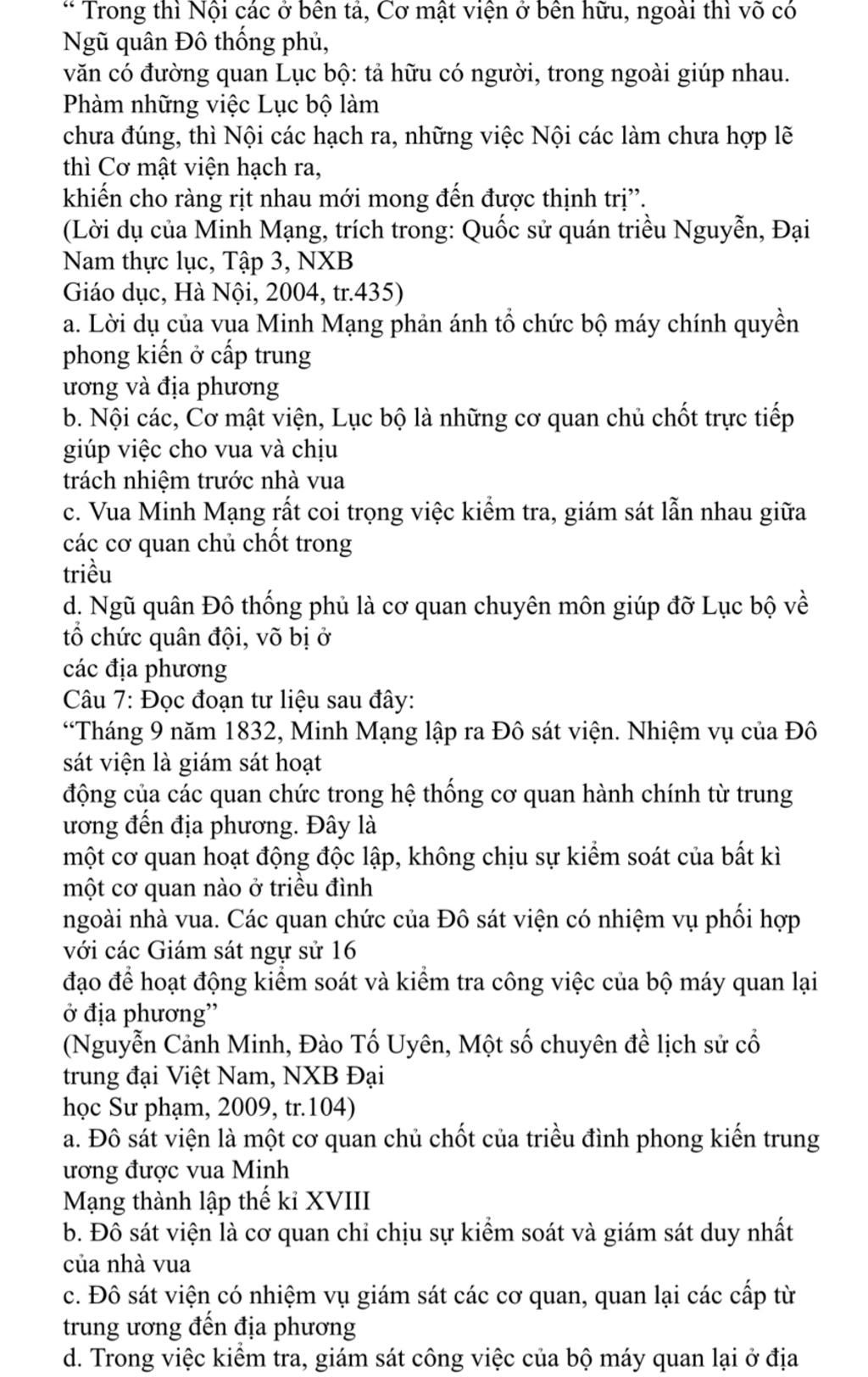 a, Đúng → vì lời dụ của vua Minh Mạng phản ánh rõ tổ chức bộ máy chính quyền phong kiến bao gồm cả cấp trung ương (Nội các, Cơ mật viện, Lục bộ) và cấp địa phương (các quan lại địa phương chịu sự giám sát của triều đình).
