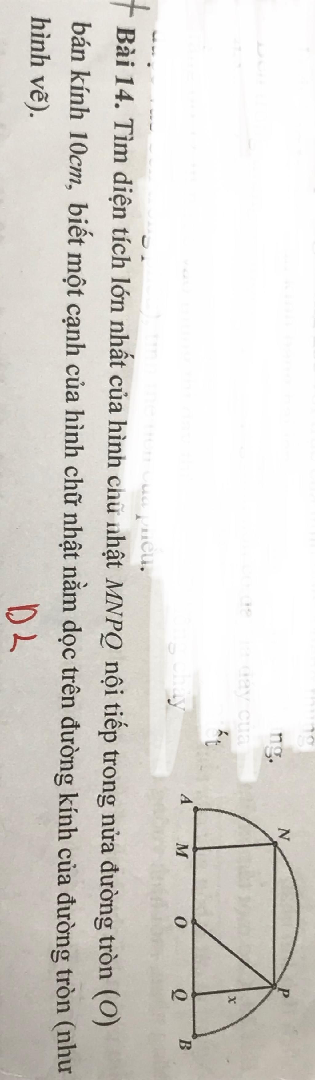 Bài 14. Tìm diện tích lớn nhất của hình chữ nhật MNPQ nội tiếp trong nửa đường tròn (O)