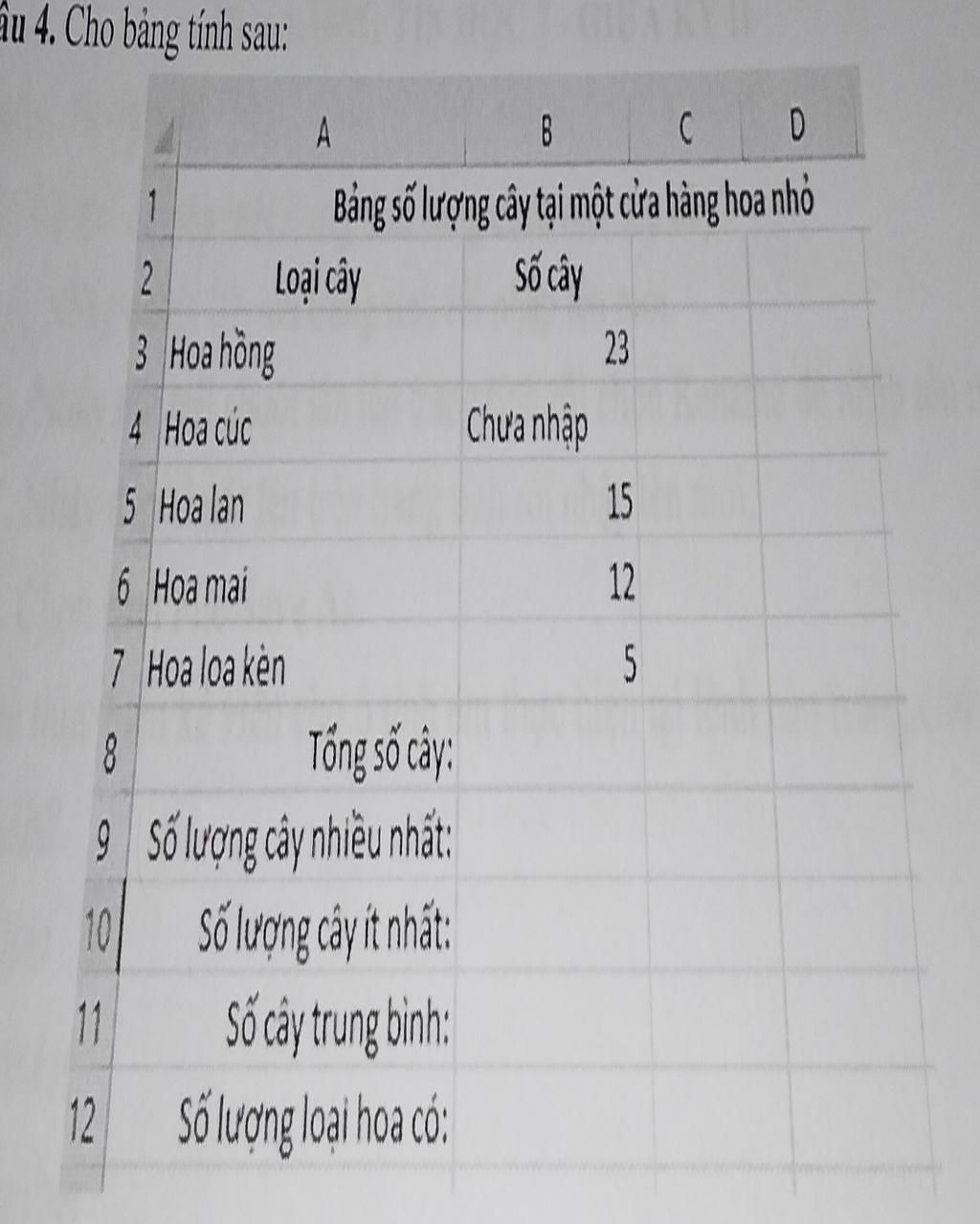 Em hãy nhập công thức tương ứng vào các ô B8, B9, B10, B11, B12 mà có sử dụng hàm và địa chỉ khối ô trông công thức?