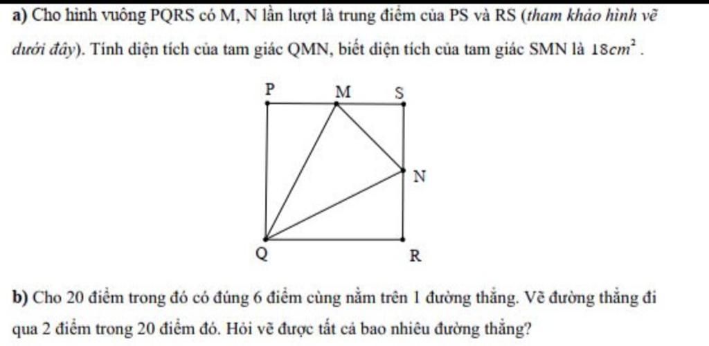 `b)` Giả sử trong `20` điểm không có điểm nào thảng hàng thì có số đường thẳng là :