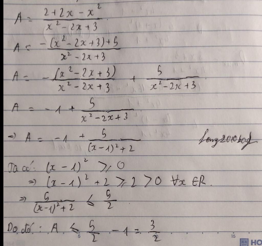 Tìm giá trị lớn nhất của biểu thức `A=(2+2x-x^2)/(x^2-2x+3)`