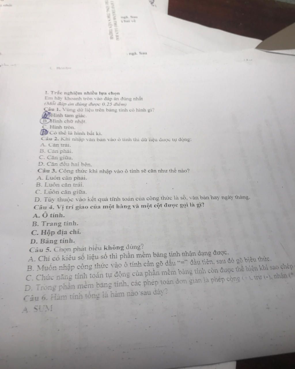 (hồi đáp án đúng được 0,25 điểm)