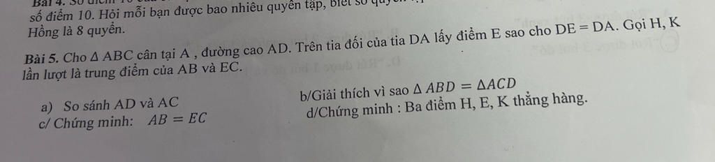 Bài 5. Cho A ABC cân tại A, đường cao AD. Trên tia đối của tia DA lấy điểm E sao cho DE = DA. Gọi H, K