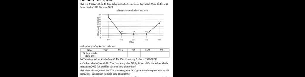 `d)` Tỉ số phần trăm Số lượt khách Quốc tế đến Việt Nam năm `2020` so với năm `2019` là :