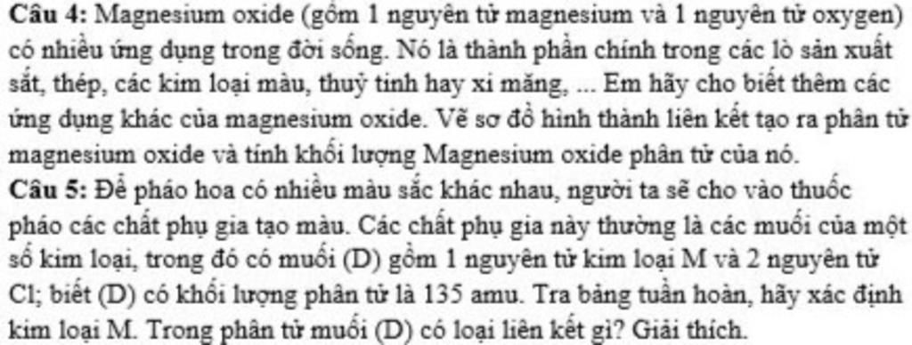 Câu 4: Magnesium oxide (gồm 1 nguyên tử magnesium và 1 nguyên tử oxygen)
