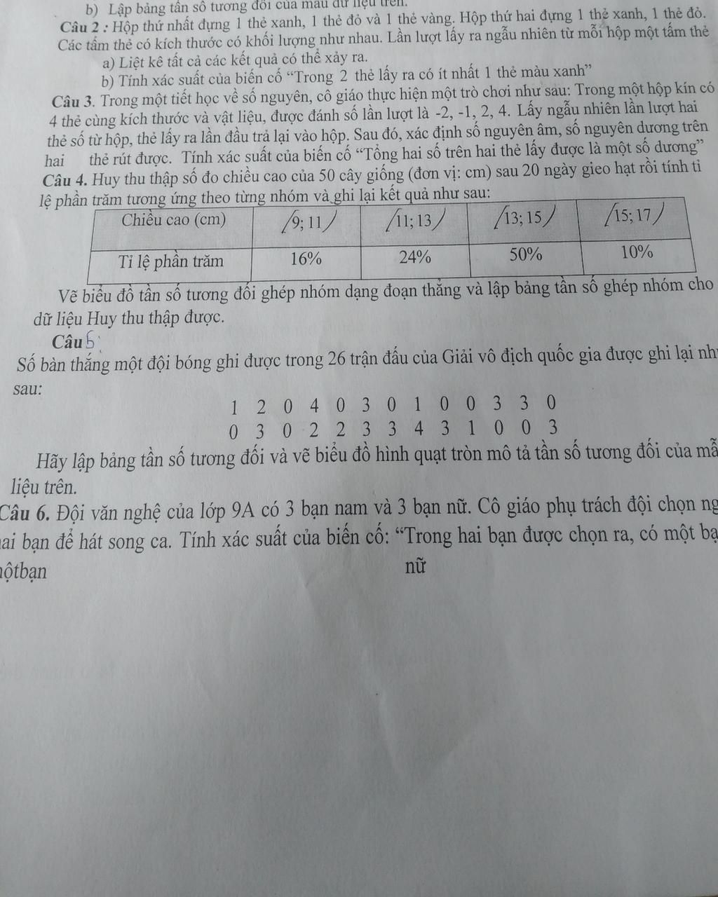 `b)` Có 4 kết quả thuận lợi cho biến cố "Trong 2 thẻ lấy ra có ít nhất 1 thẻ màu xanh" là: `(X_1; X_2); (X_1; Đ_2); (Đ_1; X_2); (V; X_2)`