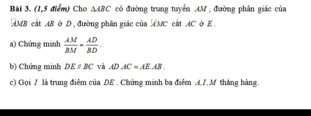 c) gọi I là trung điểm của đường thẳng DE ta có tỉ lệ xác định giữa các đoạn thẳng sử dụng định lí Menelaus với ∆ ABD với đường thẳng AIM
