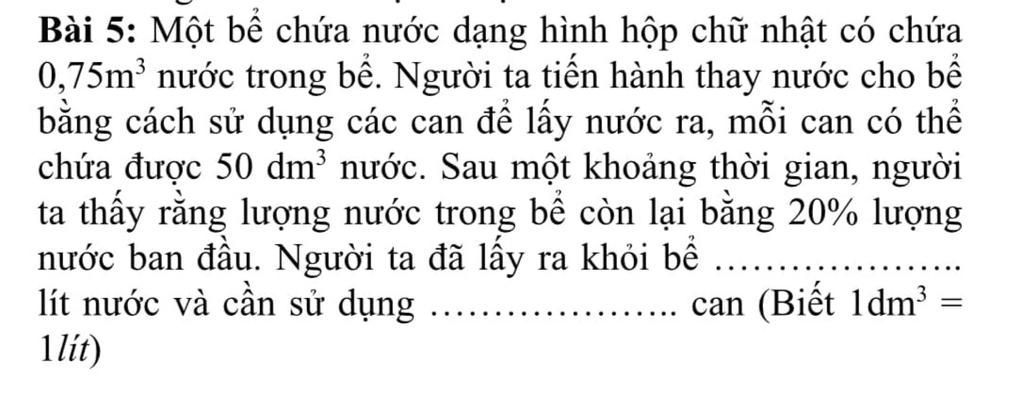 Người ta đã lấy ra khỏi bể số lít nước là `:`
