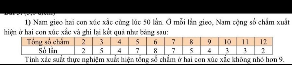 Xác suất thực nghiệm xuất hiện tổng số chấm ở hai con xúc xắc không nhỏ hơn `9` là:
