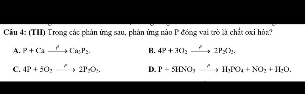 Trong các phản ứng sau, phản ứng nào P đóng vai trò là chất oxi hóa? A. P + Ca Ca3P2. B. 4P + 3O2 2P2O3. C. 4P + 5O2 2P2O5. D. P + 5HNO3 H3PO4 + NO2 + H2O.