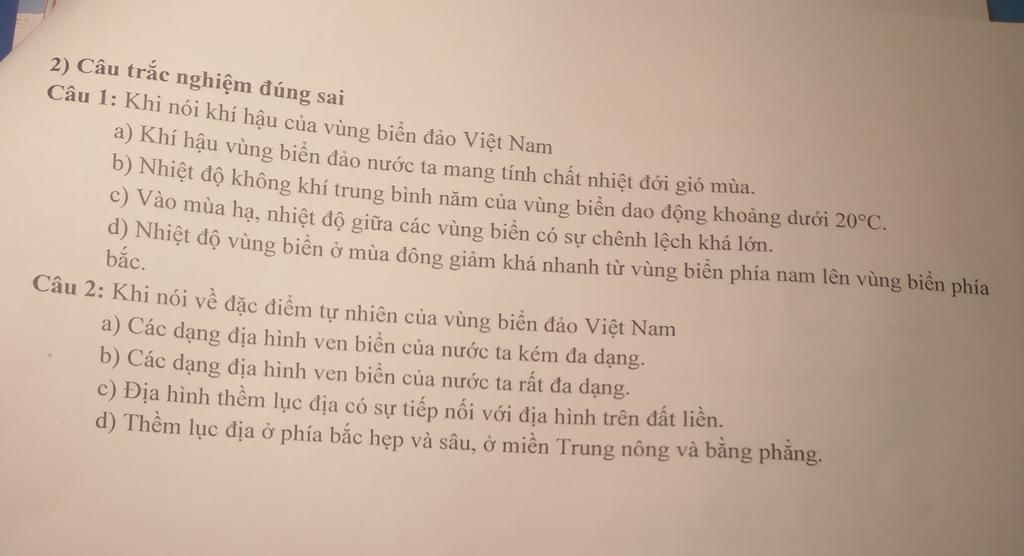 Câu 2: Khi nói về đặc điểm tự nhiên của vùng biển đảo Việt Nam