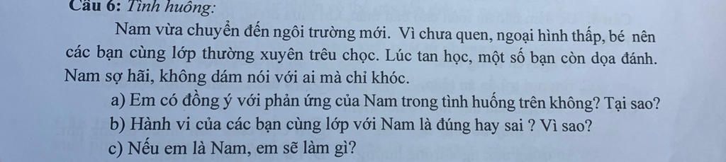 c) Nếu em là Nam em sẽ đứng ra bảo vệ bản thân mình trước, ko để họ trêu chọc hay đe dọa mình. Sau đó em sẽ báo cho thầy cô biết là em bị bắt nạt để họ có cách giải quyết hợp lý