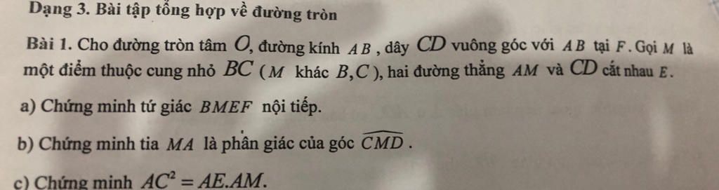 Bài 1. Cho đường tròn tâm O, đường kính AB, dây CD vuông góc với AB tại F. Gọi M là