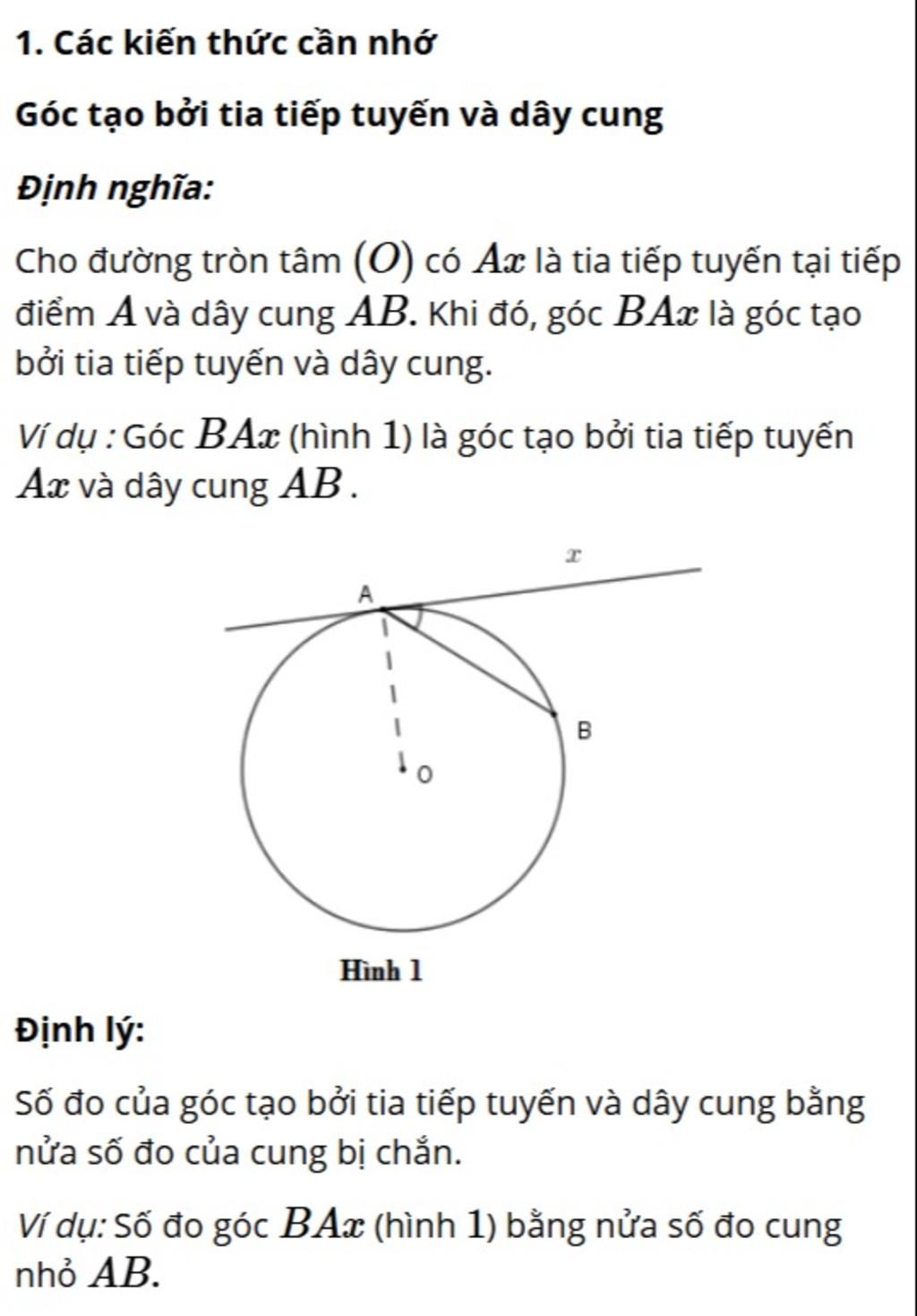`\hat{BAx} ` là góc tạo bởi tia tiếp tuyến và dây cung