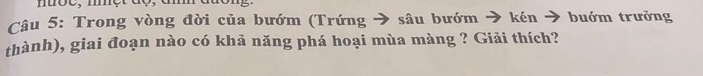 Trả lời ` :` giai đoạn có khả năng phá hoại mùa màng là " sâu bướm "