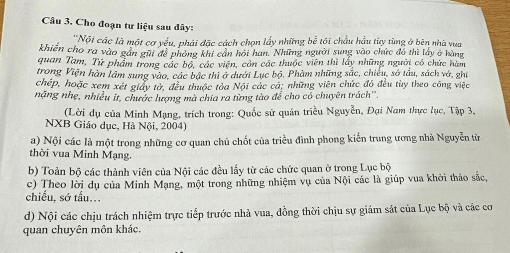 a. Đúng → Đoạn tư liệu nói rõ "Nội các là một cơ yếu", tức là một cơ quan quan trọng của triều đình.