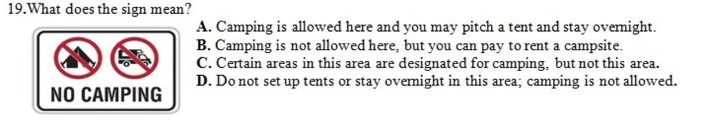 - Trong bức hình là biển báo cấm đỗ xe và dựng trại, ở dưới có dòng chữ NO CAMPING (Không cắm trại). Vậy xét các đáp án: