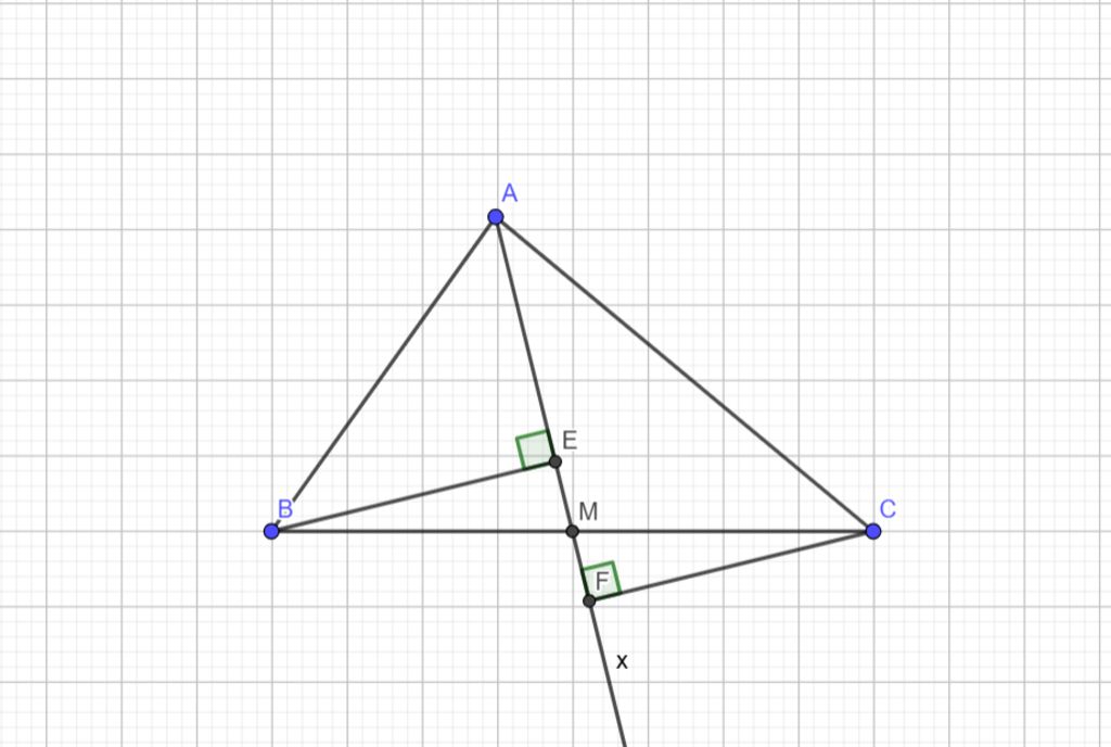 Cho tam giác ABC AB khác AC, tia Ax đi qua trung điểm M của BC. Kẻ BE và CF vuông góc với Ax (E,F thuộc Ax). a)so sánh BM và BE b)chứng minh BE song song CF.