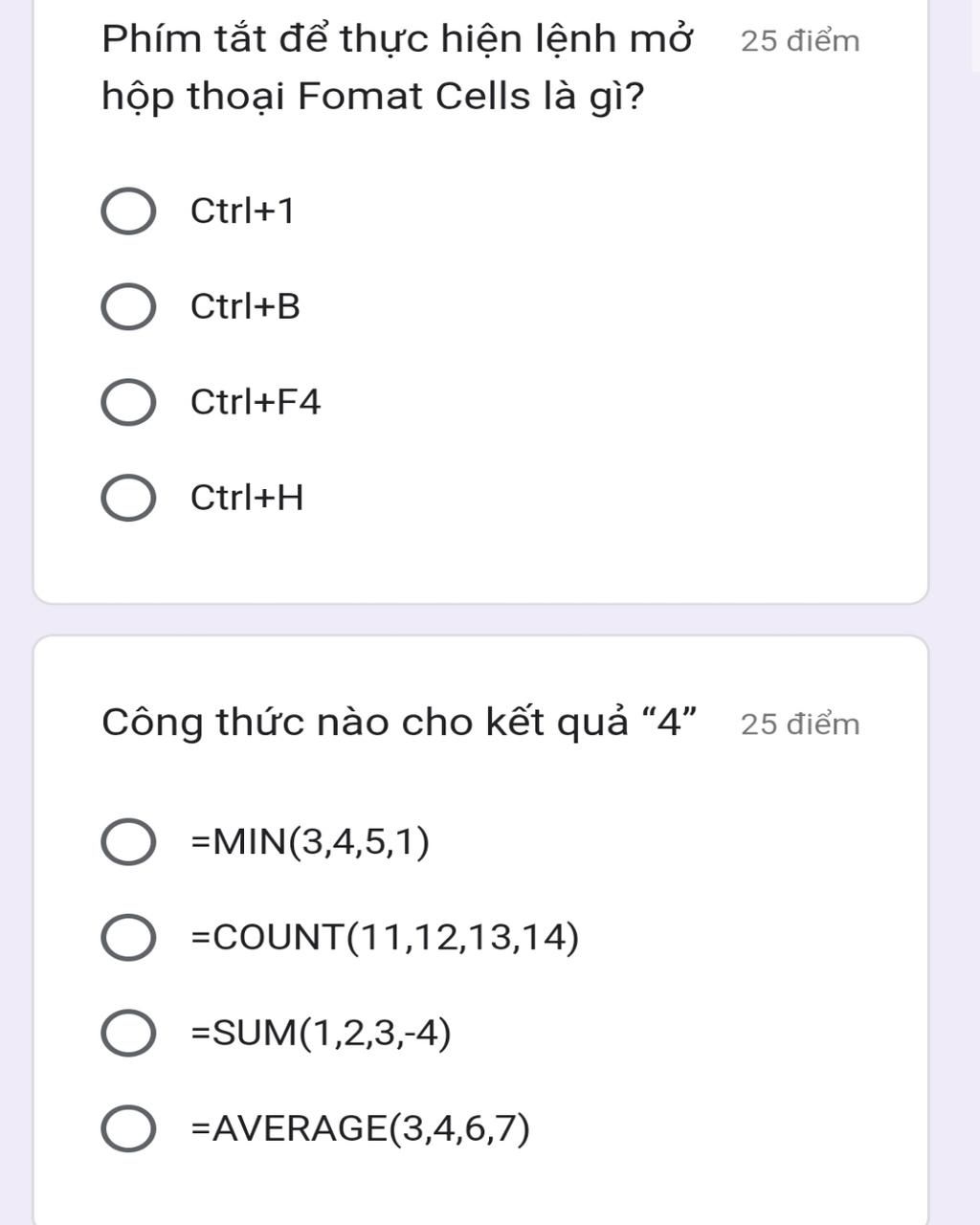 `=>` Hàm MIN trong Excel trả về giá trị nhỏ nhất trong một danh sách các số. Khi áp dụng công thức: MIN(3,4,5,1), hàm sẽ so sánh các số 3, 4, 5, và 1, và trả về giá trị nhỏ nhất, tức là 1. Để kết quả là '4'.