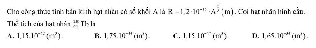 Bán kính hạt nhân: $\\$ $R=1,2.10^{-15}.159^\dfrac{1}{3}\approx 6,5.10^{-15}(m)$ $\\$Thể tích của hạt nhân:$\\$ $V=\dfrac{4}{3}\pi.R^3=\dfrac{4}{3}\pi(6,5.10^{-15})^3\approx1,15.10^{-42}(m^3)$$\\$ `color{red}{=>\ text{Chọn A}`