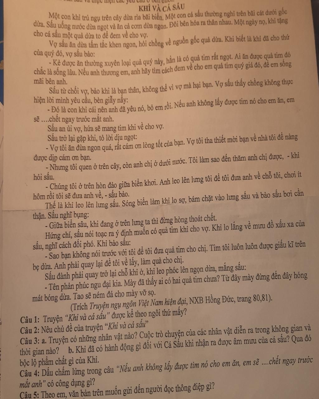 `2)` Chủ đề: Ca ngợi sự thông minh, tinh tường, sự nhanh trí của khỉ khi đối phó với nguy hiểm. Đồng thời, phê phán tính tham lam, dụ dỗ,.. cảu cá sấu.