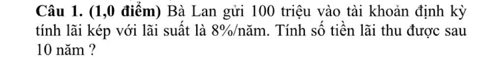 Bà Lan gửi 100 triệu vào tài khoản định kỳ tính lãi kép với lãi suất là 8%/năm. Tính số tiền lãi thu được sau 10 năm ?