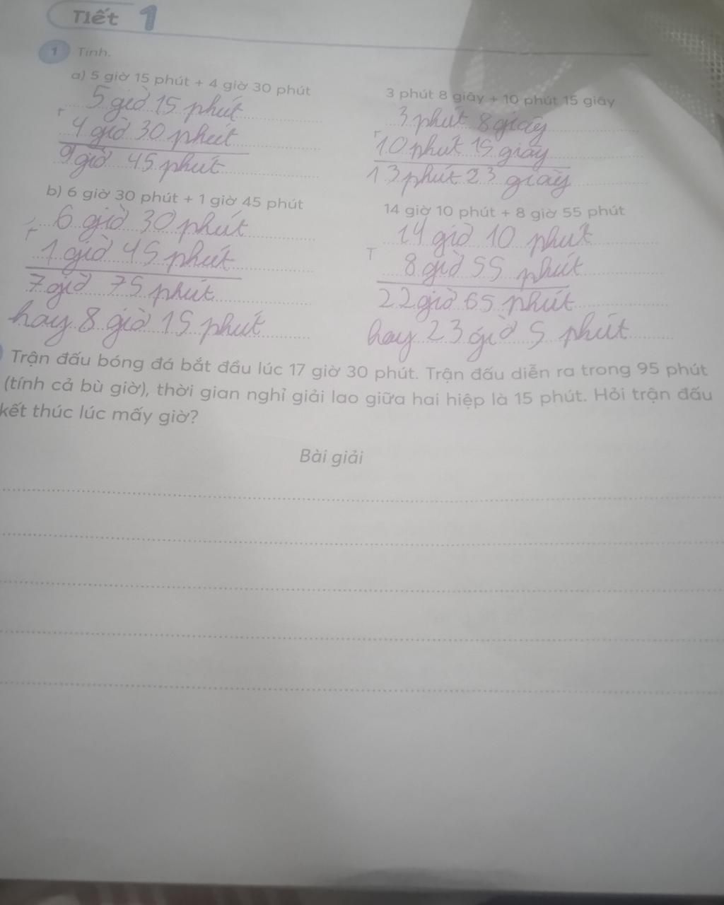 Trận đấu bóng đá bắt đầu từ 17 giờ 30 phút.Trận đấu diễn ra trong 95 phút ( tính cả bù giờ) thời gian nghỉ giải lao giữa hai hiệp là 15 phút.Hỏi trận đấu kết thúc lúc mấy giờ?