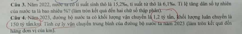 Câu `3`: $\\$ CT: $\\$TLGTTN `(%)= (`Tỉ lệ sinh thô $-$ Tỉ lệ tử thô`):10`$\\$ Tỉ lệ gia tăng dân số tự nhiên của nước ta:$\\$ `(15,2-6,1):10=0,91(%)`$\\$ Câu `4`: $\\$ CT: Khối lượng luân chuyển `=` khối lượng vận chuyển `xx` cự li vận chuyện$\\$ `=>` Cụ li vận chuyển `=` khối lượng luân chuyển `:` khối lượng vận chuyển$\\$ Cự li vận chuyển trung bình của đường bộ nước ta năm `2023`:$\\$ `150:1,2=125\ (km)`