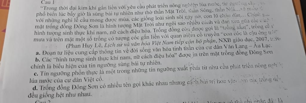 a. Đoạn tư liệu cung cấp thông tin về đời sống tinh thần và tín ngưỡng của cư dân Văn Lang – Âu Lạc. ⇒ Đúng