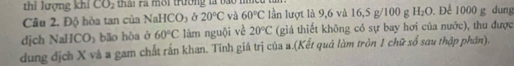 Câu 2. Độ hòa tan của NaHCO3 ở 20°C và 60°C lần lượt là 9,6 và 16,5 g/100 g H2O. Để 1000 g dụng