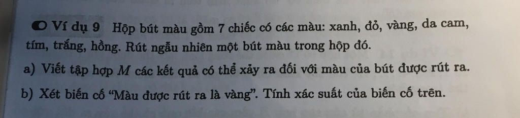 Vì rút ngẫu nhiên `1` bút màu nên khả năng xảy ra của mỗi biến cố `M_1,M_2,M_3,M_4,M_5,M_6,M_7` là như nhau. Trong mỗi lượt rút bút màu, luôn xảy ra duy nhất `1` trong các biến cố này nên xác suất của bằng nhau và bằng `1/7`