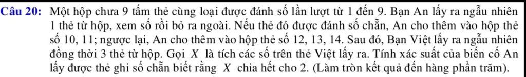 Gọi $A$ là biến cố thẻ lấy ra ghi số chẵn