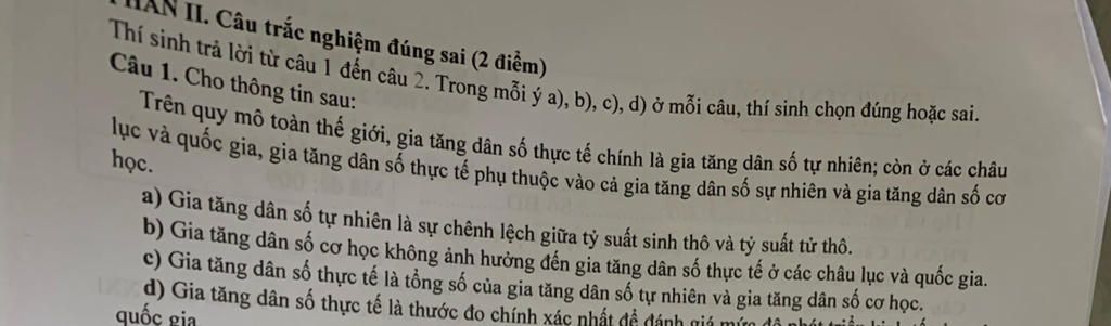 c) Gia tăng dân số thực tế là tổng số của gia tăng dân số tự nhiên và gia tăng dân số cơ học. ⇒ ĐÚNG.