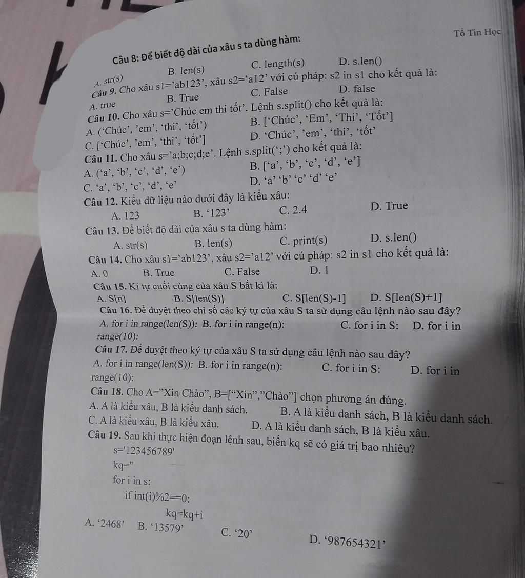 8.B: để biết độ dài của một xâu (chuỗi) s trong Python, bạn dùng lệnh: len(s)