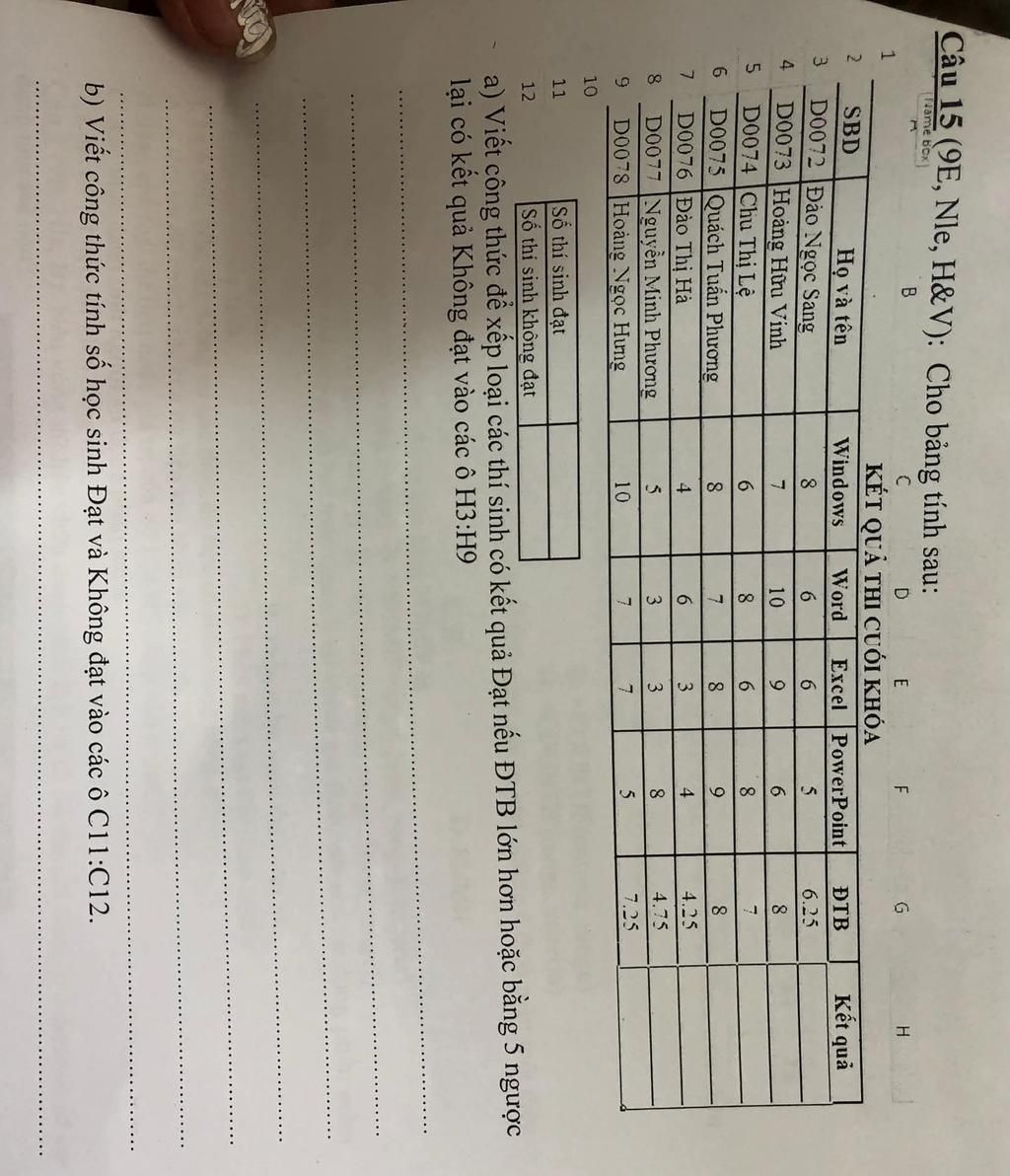 b)C11: =COUNTIF(H3:H9,'Đạt')